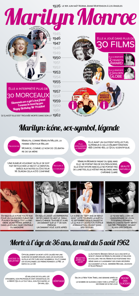 De son vrai Norma Jeane Mortenson est devenue une icone et même un mythe. La star est née le 1er juin 1926 soit 90 ans. Pour résumer sa vie courte mais intense, cela n’est pas si simple entre le cinéma, ses relations dans sa vie privée. Mais en guise de résumé, découvrez ce visuel retraçant sa carrière en tant qu’actrice et chanteuse, rappelant les anecdotes les plus célèbres de sa vie, dévoilant des curiosités moins connues et revenant bien évidemment sur le mystère de sa mort le 5 août 1962.