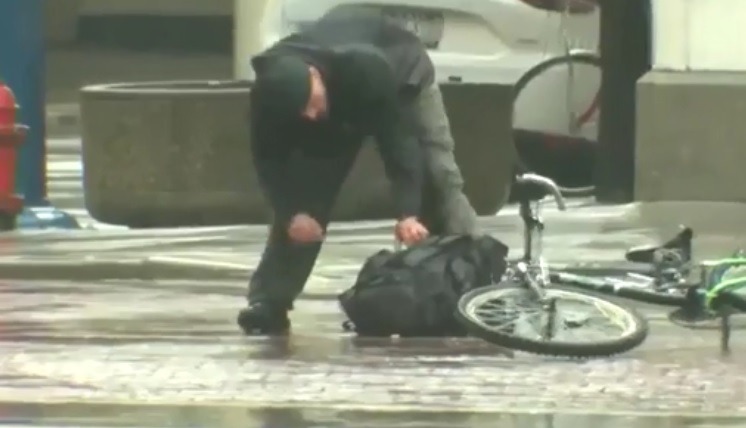 Jusqu’à là pas d’incident ni de danger, mais un cycliste exapéré par la lenteur de la procédure, a décidé de jouer les héros ou les imbéciles (faites votre choix). Cet individu a bravé le cordon de sécurité et est allé vider devant toutes les forces de l’ordre présente sur place afin de monter que le sac ne comportait rien de dangereux.